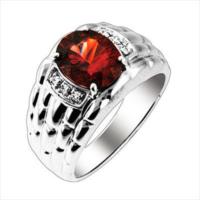 Crafted from 14K white gold, this ring displays one oval cut 9x7mm rhodolite in four prong setting. A polished, links design shank is accented with 6 round full cut diamonds in beads settings. The rhodolite weighs 2.8500ct and the total dismond weight is 0.06ct (both approximate). The ring measures 11/16"L x 7/16"W x 5/16"H.