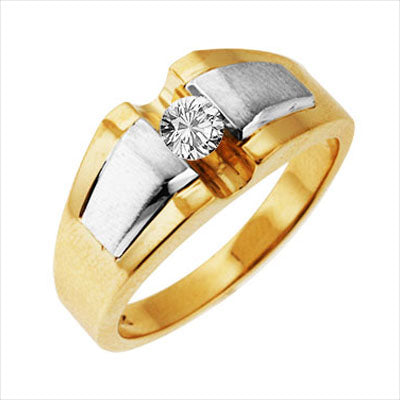 Command vibrant style. Crafted from 14K yellow and white gold, this ring displays one round full cut diamond 0.3000 in channel settings. The wide, polished band has ridged accents in light polish 14K yellow gold and brush satin in white 14k gold. An under gallery makes for a comfortable fit.