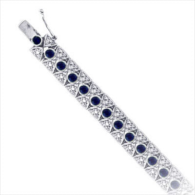 14KWG Diamond and Blue Sapphire Bracelet. A timeless look of enduring sophistication! This tennis style bracelet is crafted in 14K White Gold. It features 26 round cut Blue Sapphires in prong settings and 156 full round cut diamonds. The total diamond weight is approximately 2.496 ct with a color of H and a clarity of SI. The blue sapphires weight is 2.600ct.