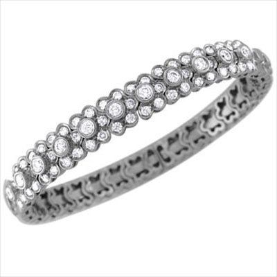 14K 7 1/4" WG, RG or YG 2.70ct Diamond Flower Flex bangle. This bracelet is crafted in your choice of polished 14K white, rose or yellow gold. It features 66 round full cut diamonds in bezel settings. The total diamond weight is approximately 2.70ct with a color of G-H and a clarity of SI2. It measures 7 1/4"L x 5/16"W.