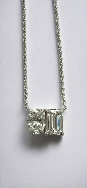 This is a stunning 14K White Gold Emerald cut and Oval cut Diamond Pendant Necklace that is so modern and elegant. It features 1 Emerald cut diamond 0.50ct and 1 Oval cut diamond 0.50ct, which has a total weight of 1ct. This pendant comes with an 18 Inch Cable Chain with a lobster lock and has a jump ring at 16 Inches.