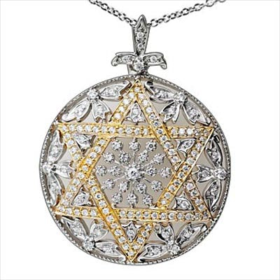 14KTT Decorative Star of David Diamond 1.3025ct Disk Pendant w/ Chain. Create a style of shimmering brilliance with this lovely pendant. It is made with polished 14K white gold and features 163 round cut diamonds in rhodium plated bead settings in a disk design pendant with a Star of David in yellow gold. The total diamond weight is approximately 1.3025ct (color: GH, clarity: SI). It measures 1-1/2" x 1-3/16" (width of 1/4") and comes with a 18" chain that has a lobster claw clasp.