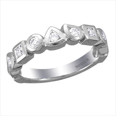 14K WG or YG 0.50ct Diamond Geometric Band. This band is crafted in your choice of polished 14K white or yellow gold. It features 11 full round cut diamonds in bezel settings. The total diamond weight is approximately 0.50ct with a color of G-H and a clarity of SI. The setting size is 1/8" x 3/4" with a height of 1/16".