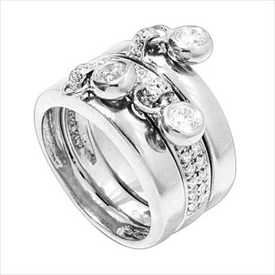 14K Three-row Stacked Dangle Diamond 0.774ct Ring. Liven up your look with a truly chic and unique ring set that dangles and dazzles! Crafted in 14K White or Yellow Gold, the ring shines with three round full cut 0.013 diamonds in bezel settings and various round full cut diamonds in pave settings.The three ring set consists of one band studded with sparkling pave set diamonds and two polished bands. Each band features one bezel set diamond that daintily dangles for an eye-catching effect! The total diamond weight is approximately 0.774ct. The ring measures 1/2"L x 13/16"W x 1/4"H.